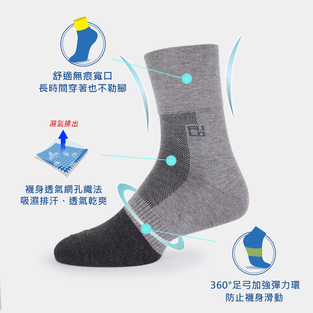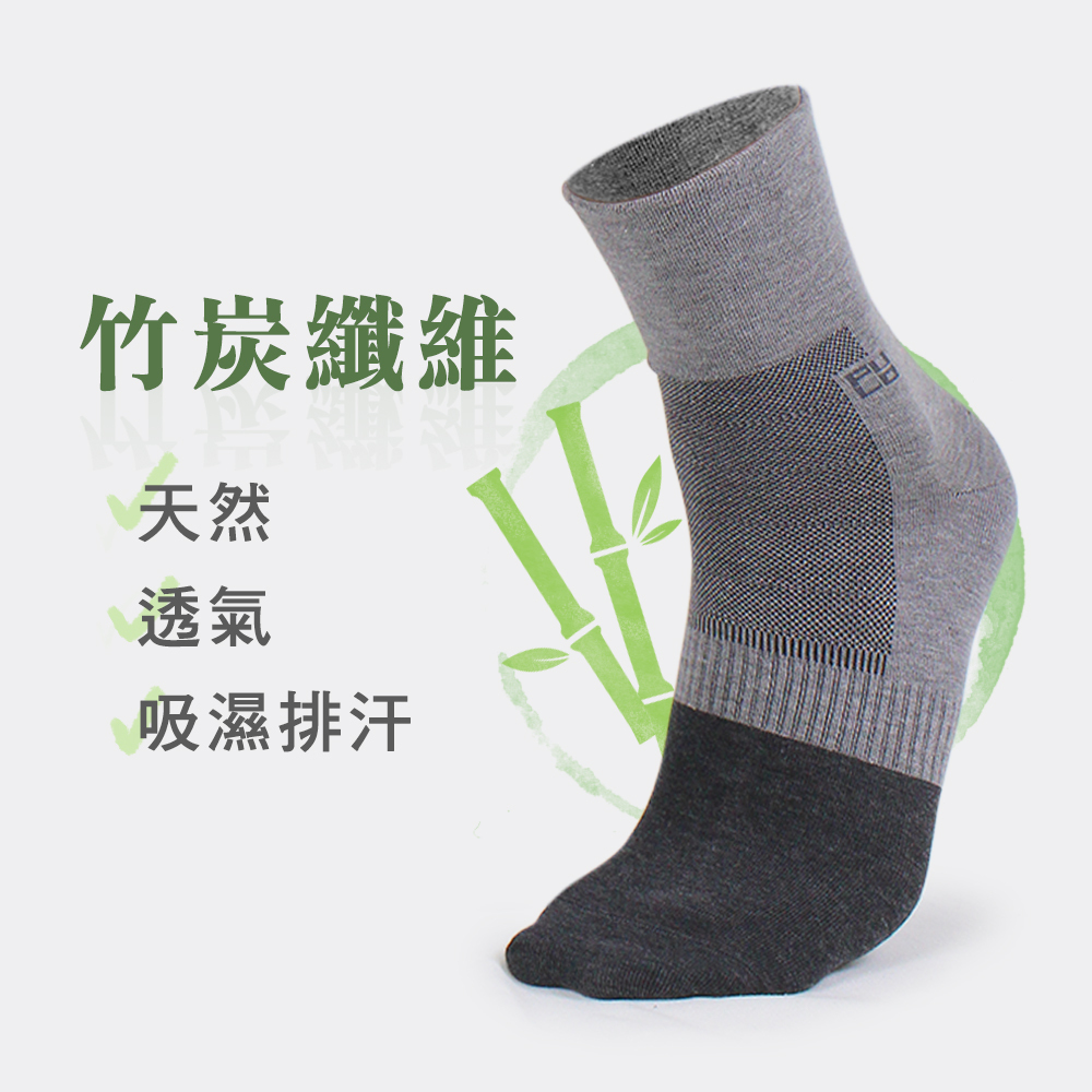 採用天然竹炭纖維製成,纖維質地細緻,乾爽透氣。無痕寬口襪口設計,即使長時間穿著也不勒腳痕。足弓處360度彈力環設計,防止襪身滑動。腳背透氣網孔織法,提升吸濕排汗速率。