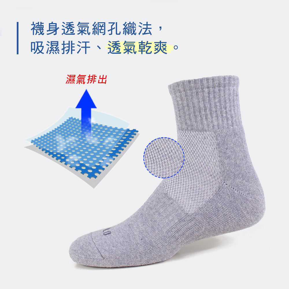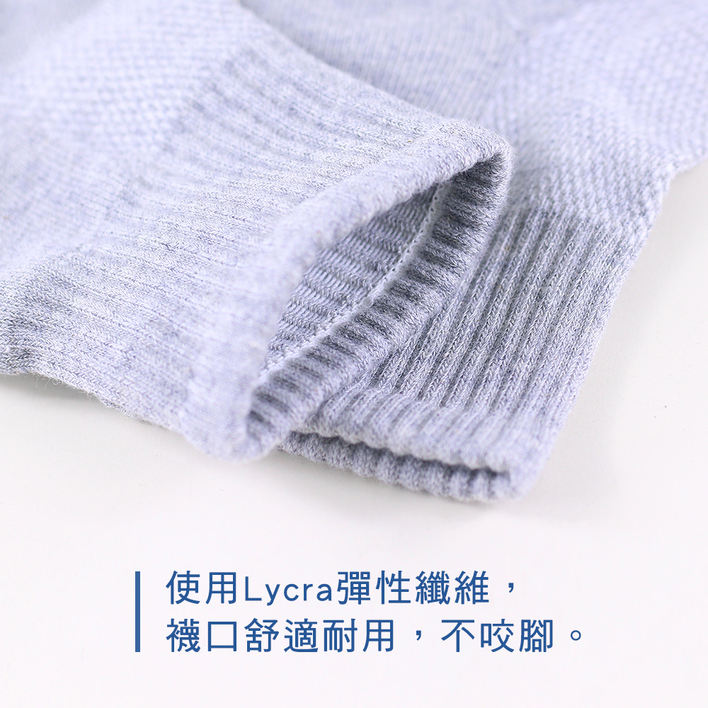 嚴選精梳棉素材,輕膚細緻觸感,透氣舒適;使用知名品牌萊卡®彈性纖維,不咬腳、不鬆脫;氣墊毛巾底。
