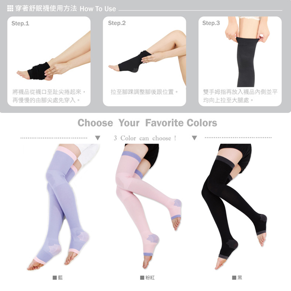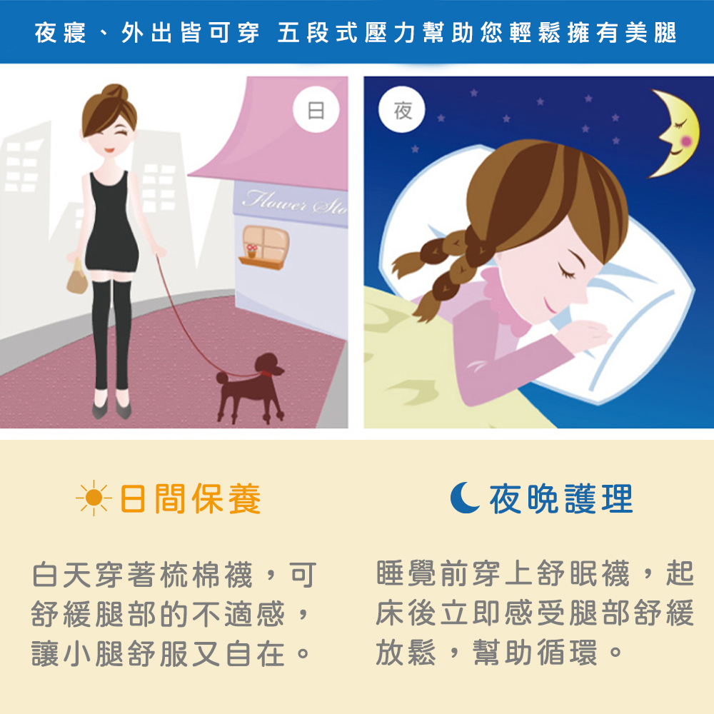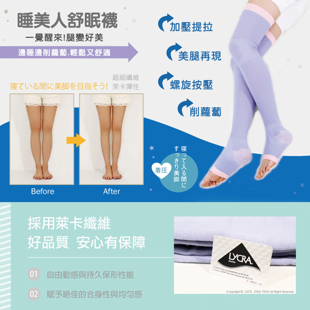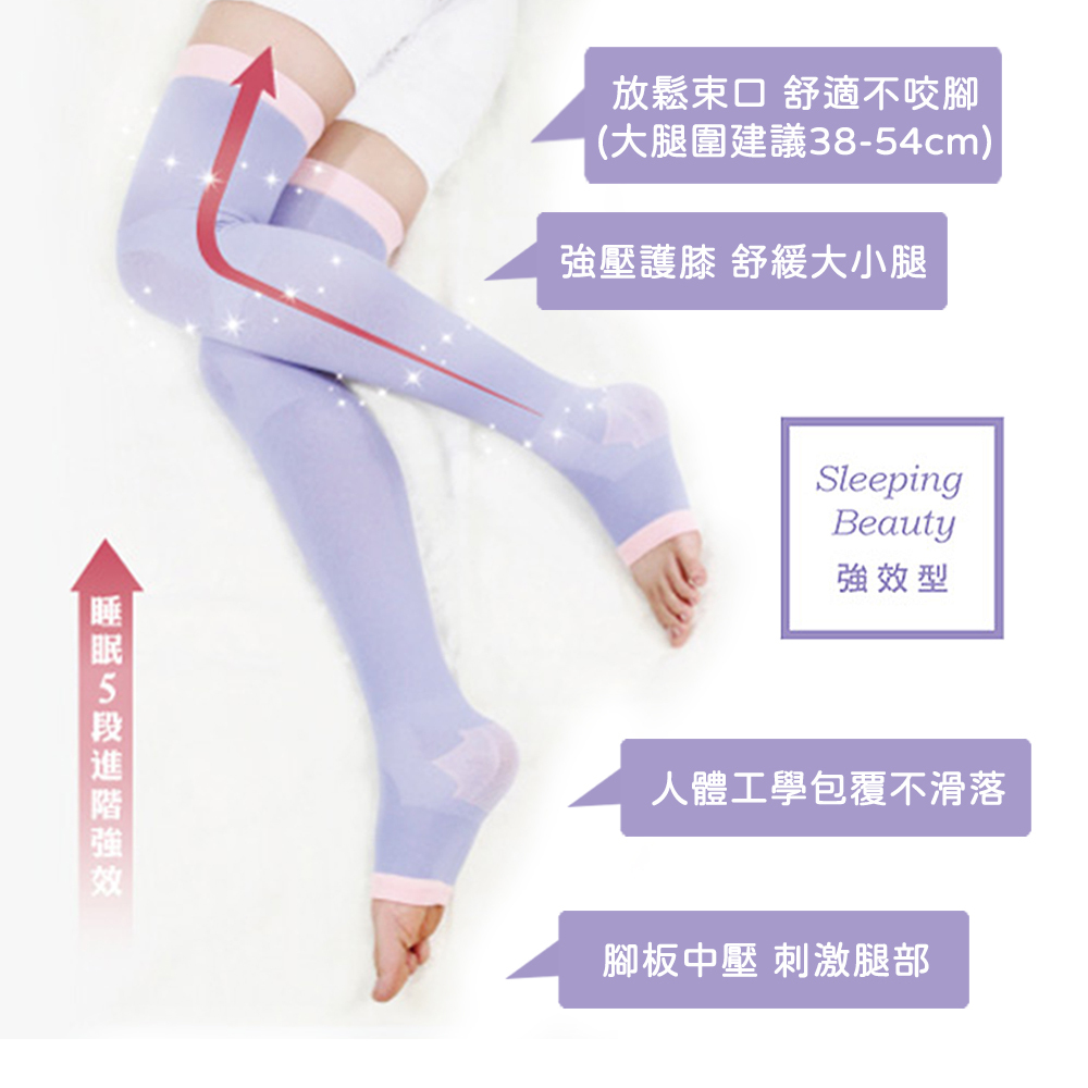 睡眠5段進階強效特性:全面向上提拉維持腿型,加強形狀特性,同時放鬆舒緩,腳底到大腿,更拉長雙腿勻稱。