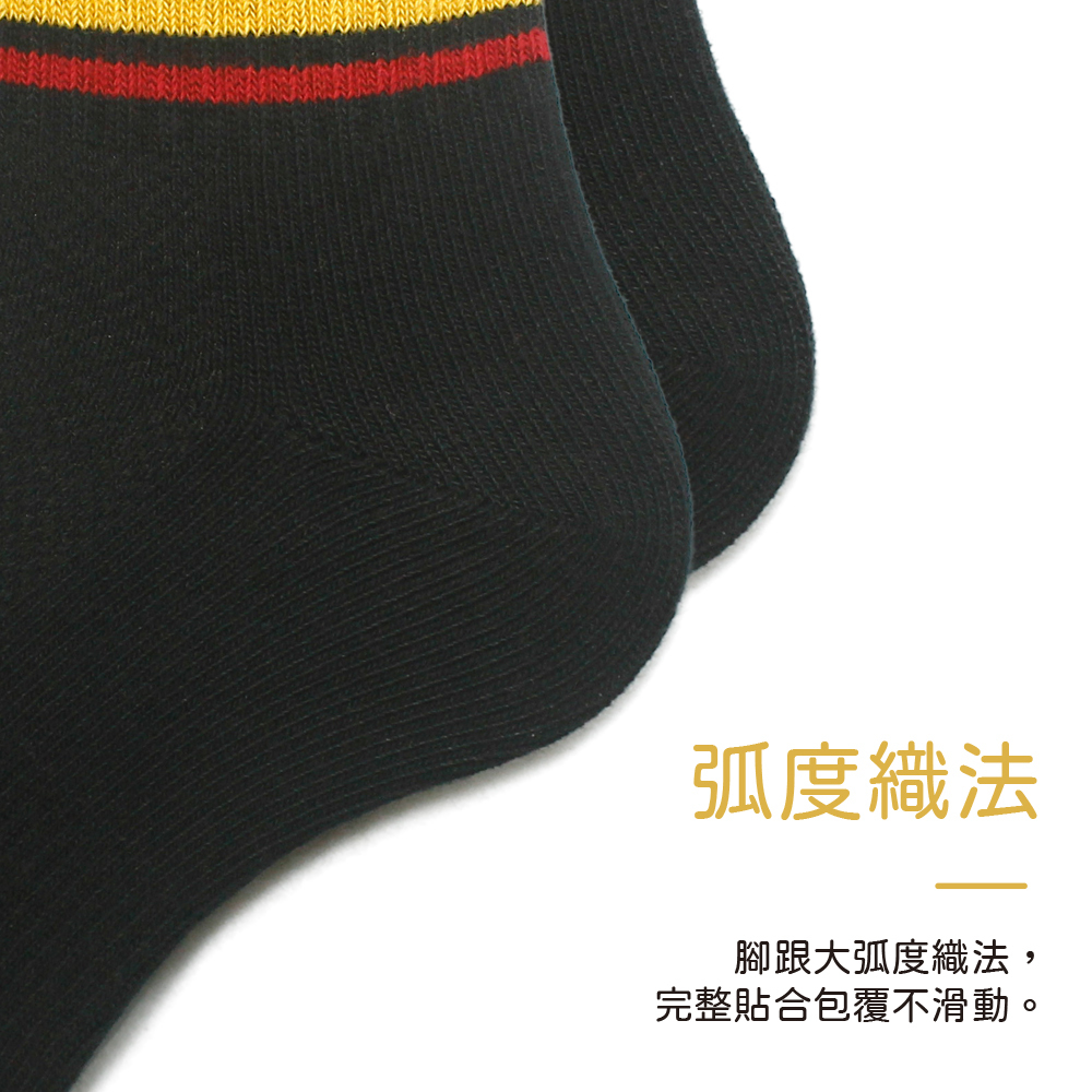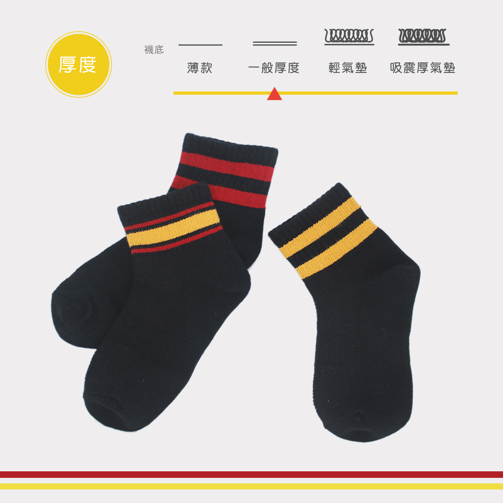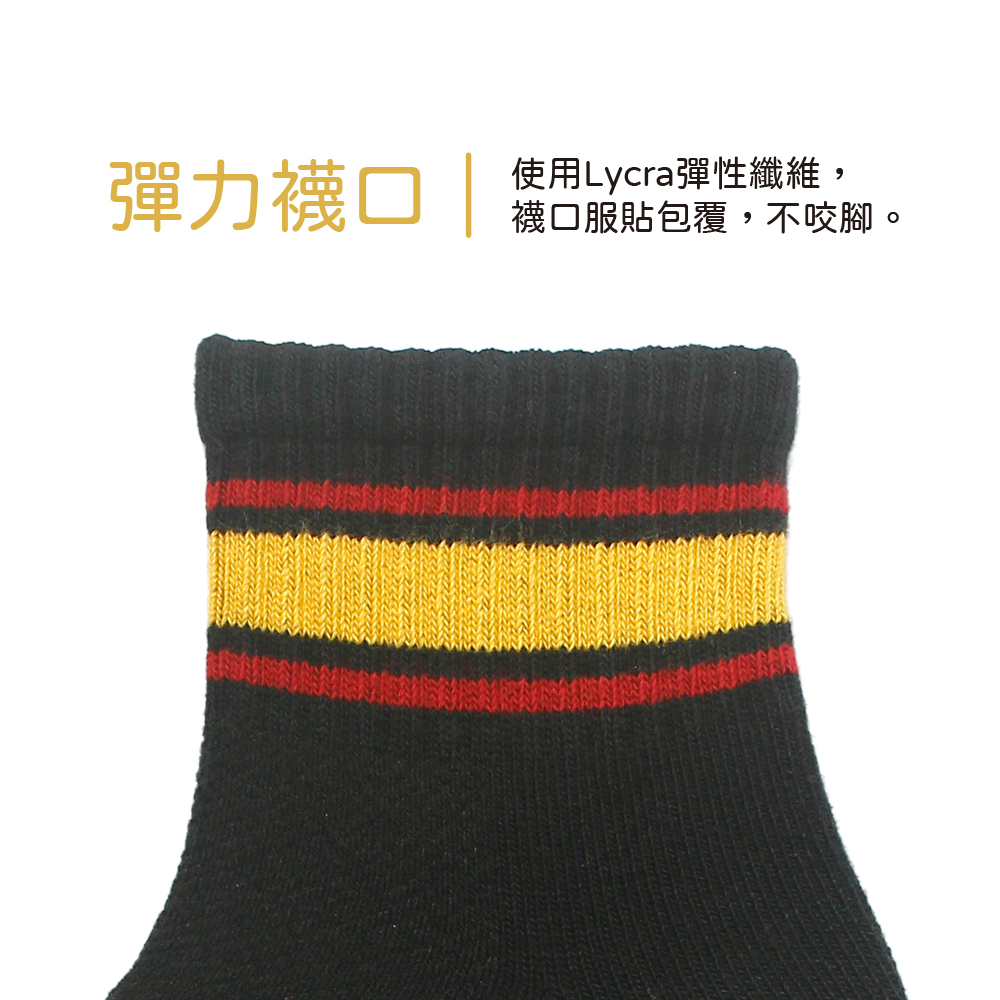 嚴選精梳棉素材,輕膚細緻觸感,透氣舒適;使用知名品牌萊卡®彈性纖維,不咬腳;無氣墊,一般厚度。