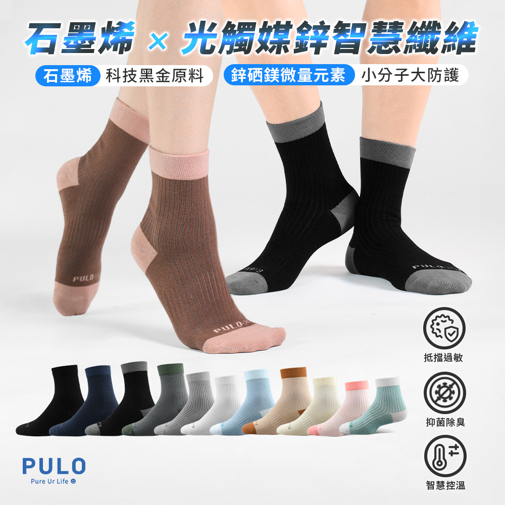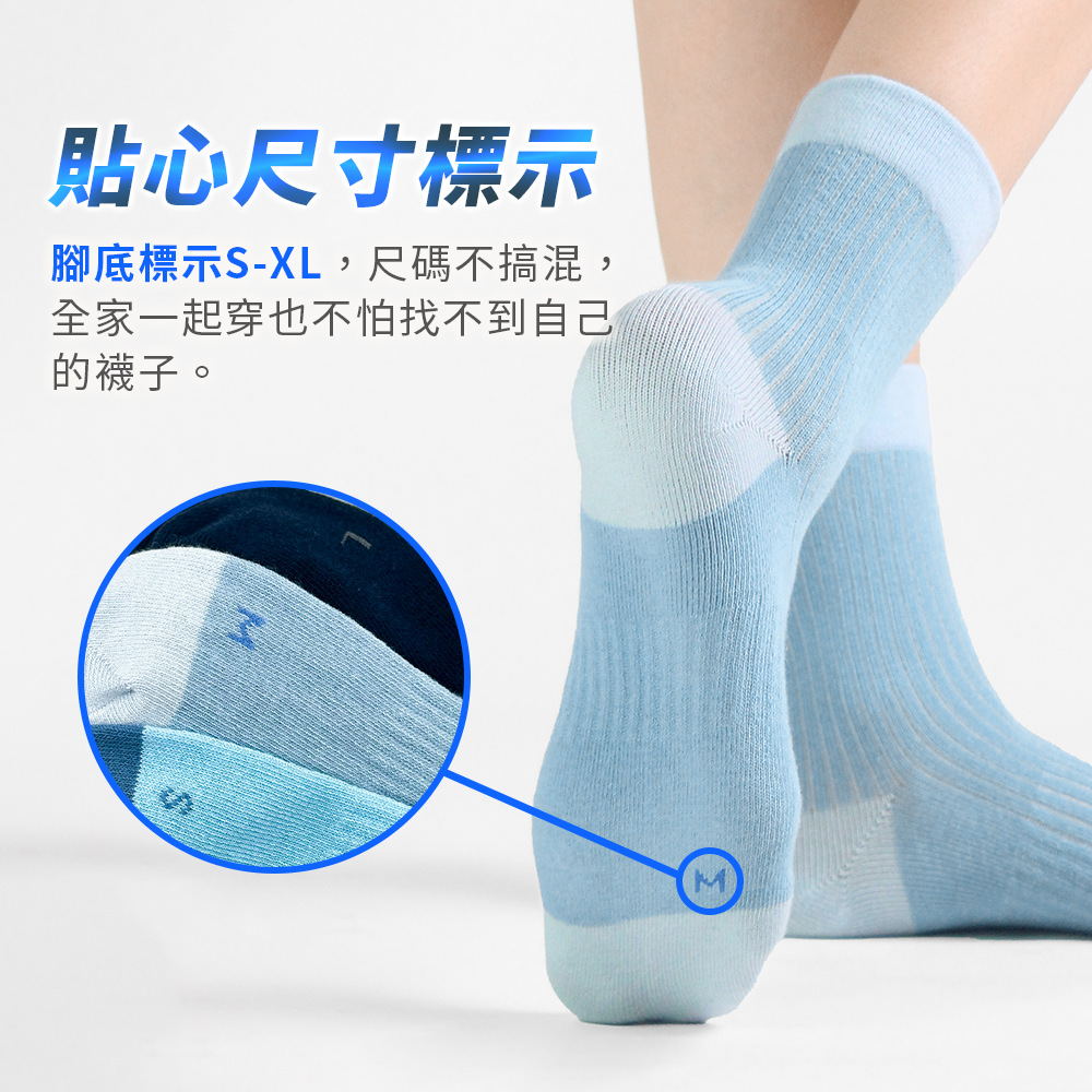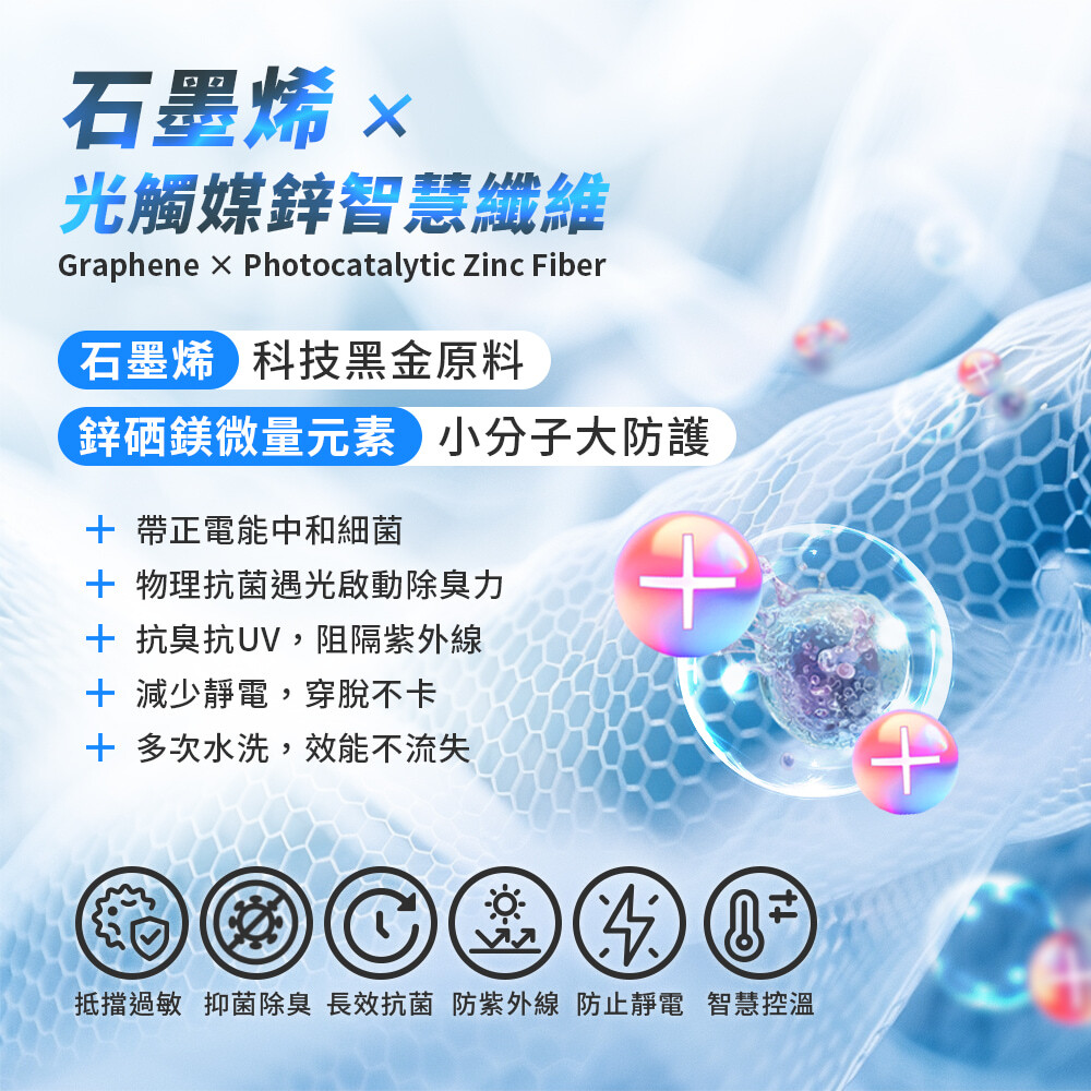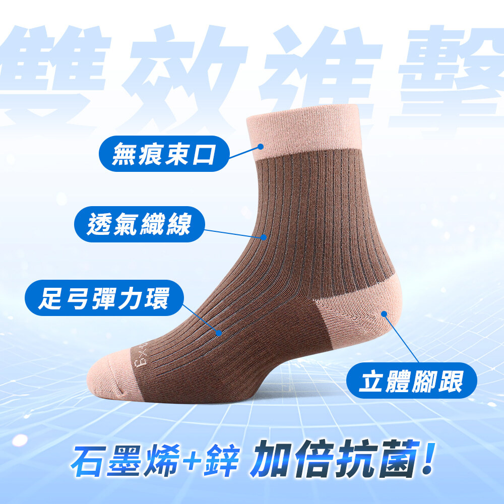 石墨烯+鋅硒鎂微量元素雙效纖維,帶正電能中和細菌,多次水洗,效能不流失。四種尺寸多色選擇,無痕襪口穿整天都舒適。