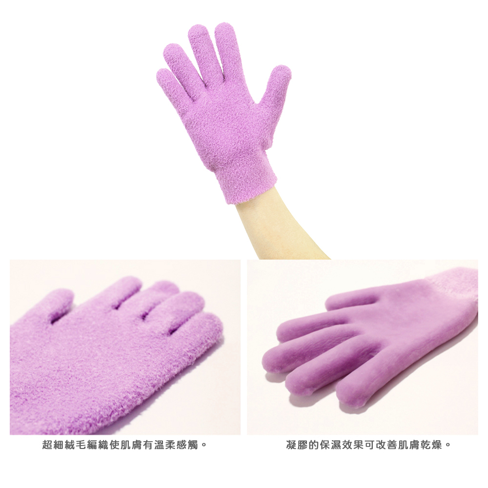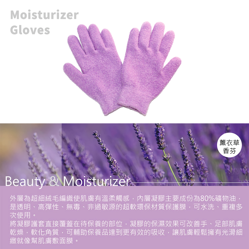 外層為超細絨毛編織,內層凝膠為80%礦物油,凝膠的保濕效果可改善手、足部肌膚乾燥,軟化角質,使肌膚輕鬆擁有光滑細緻。