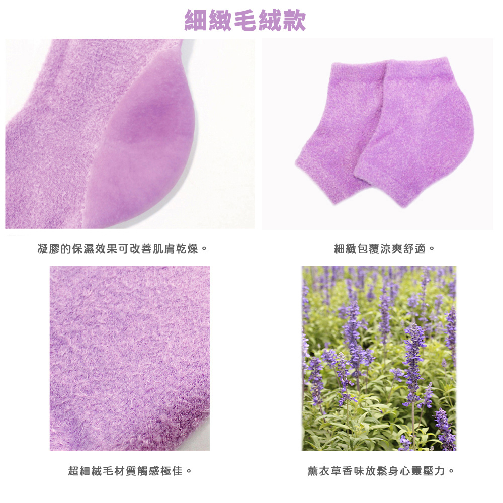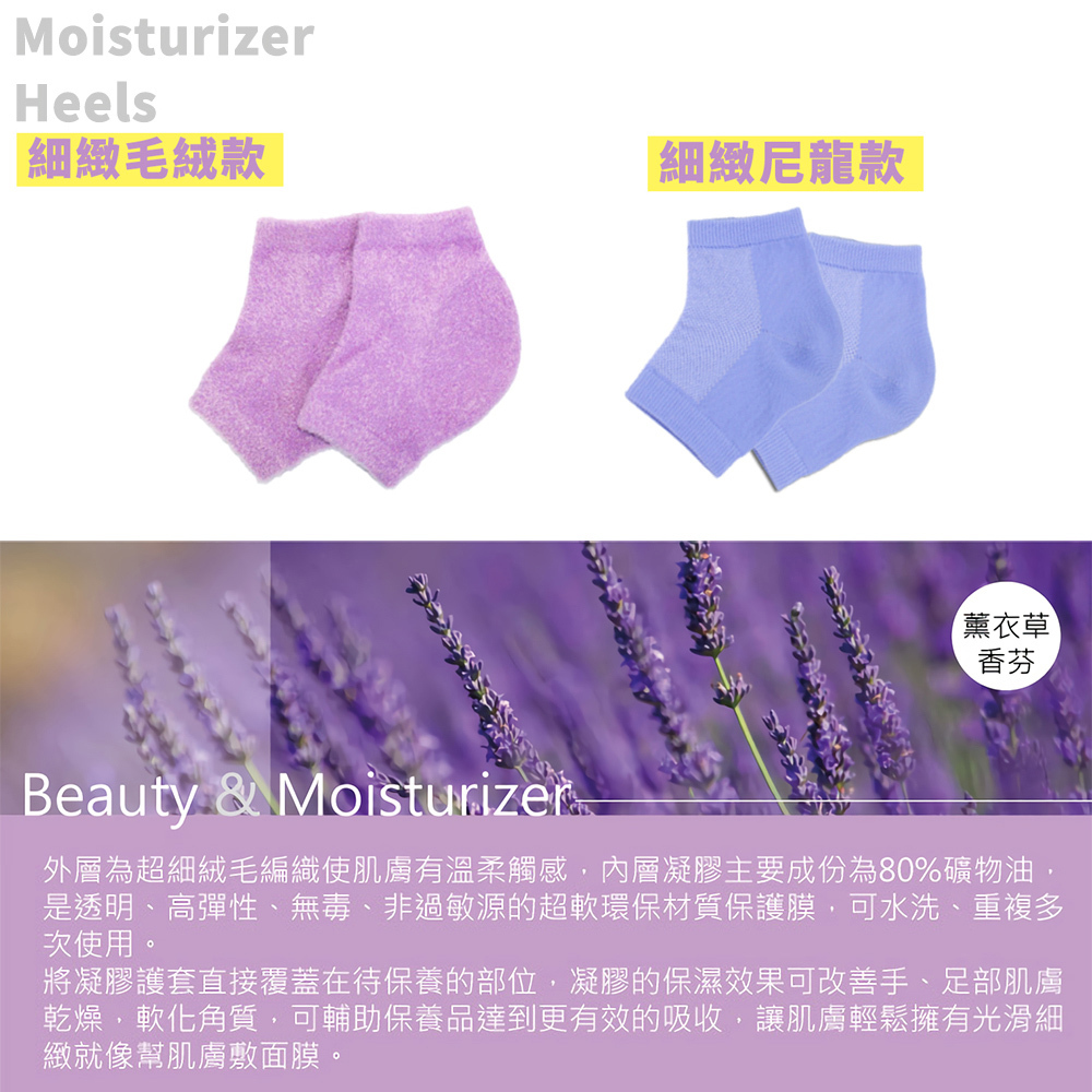 外層為超細絨毛編織,內層凝膠為80%礦物油,凝膠的保濕效果可改善手、足部肌膚乾燥,軟化角質,使肌膚輕鬆擁有光滑細緻。