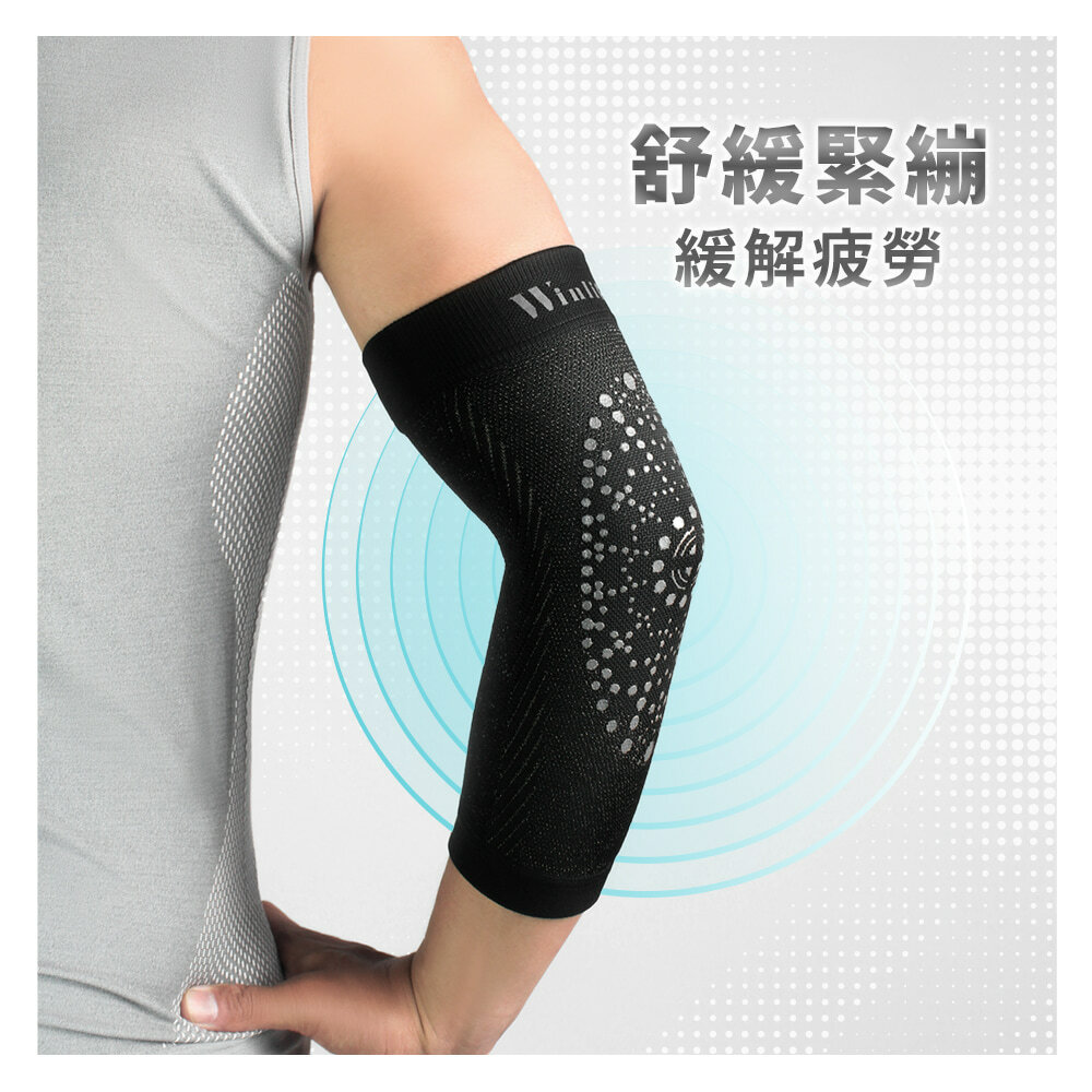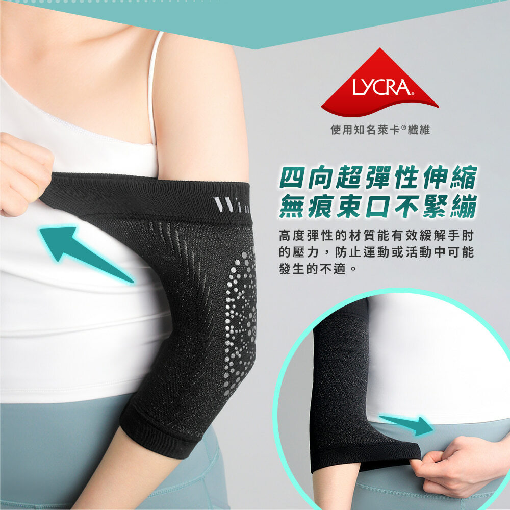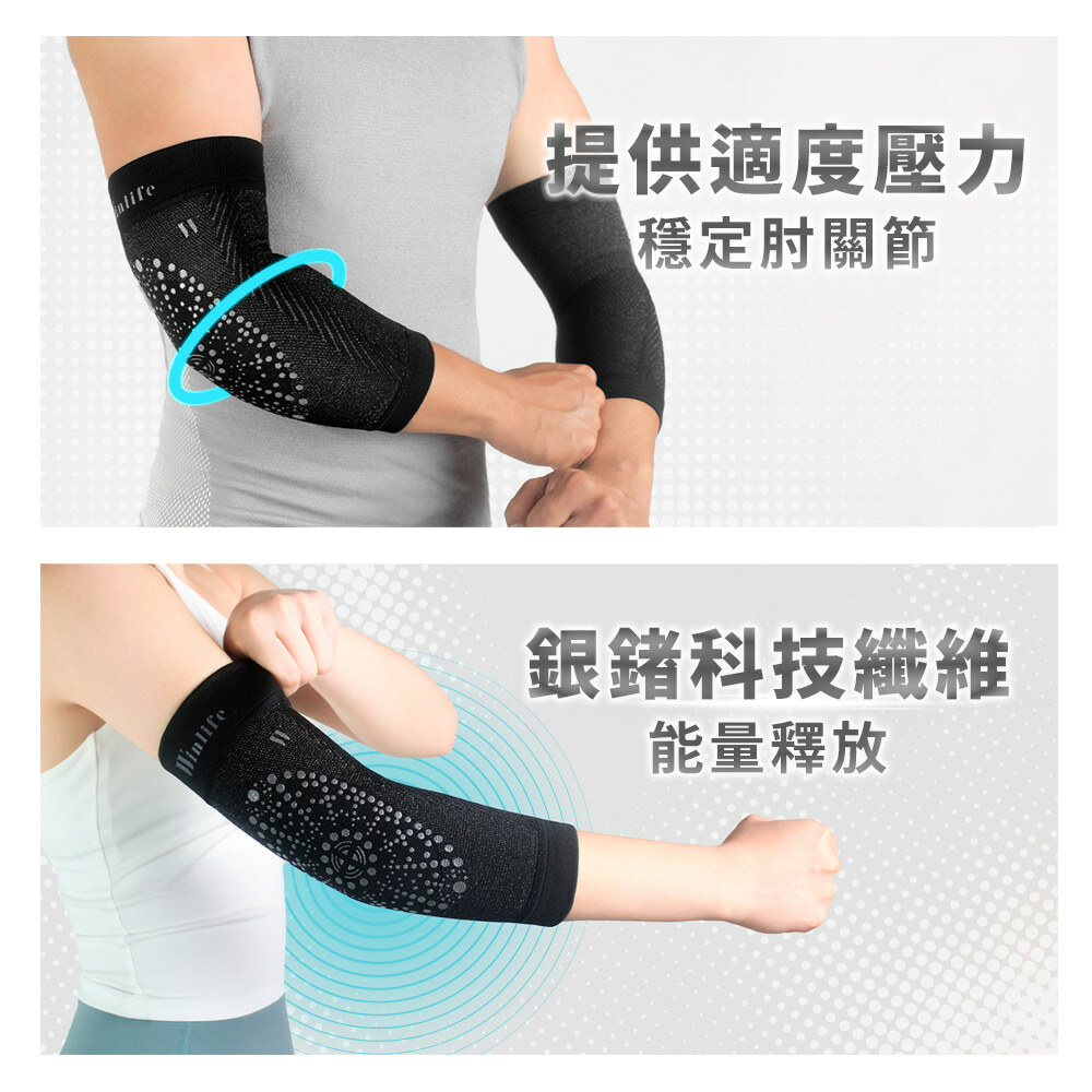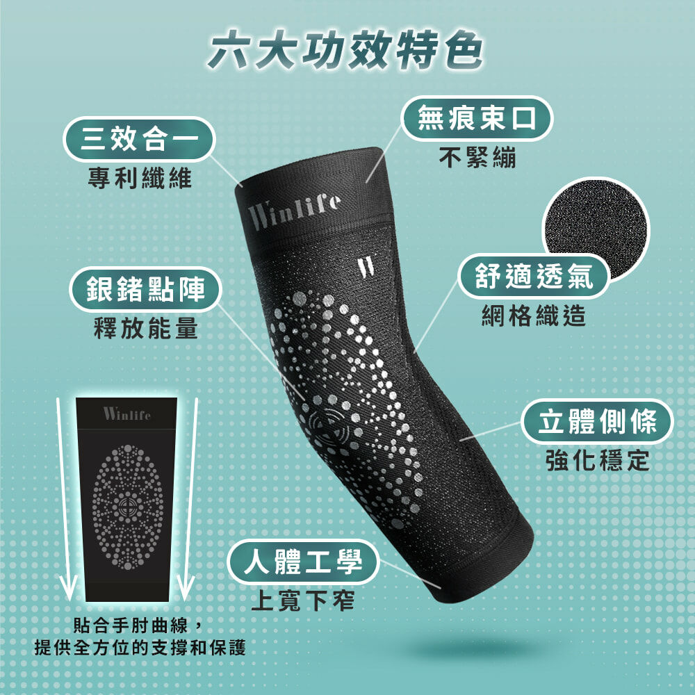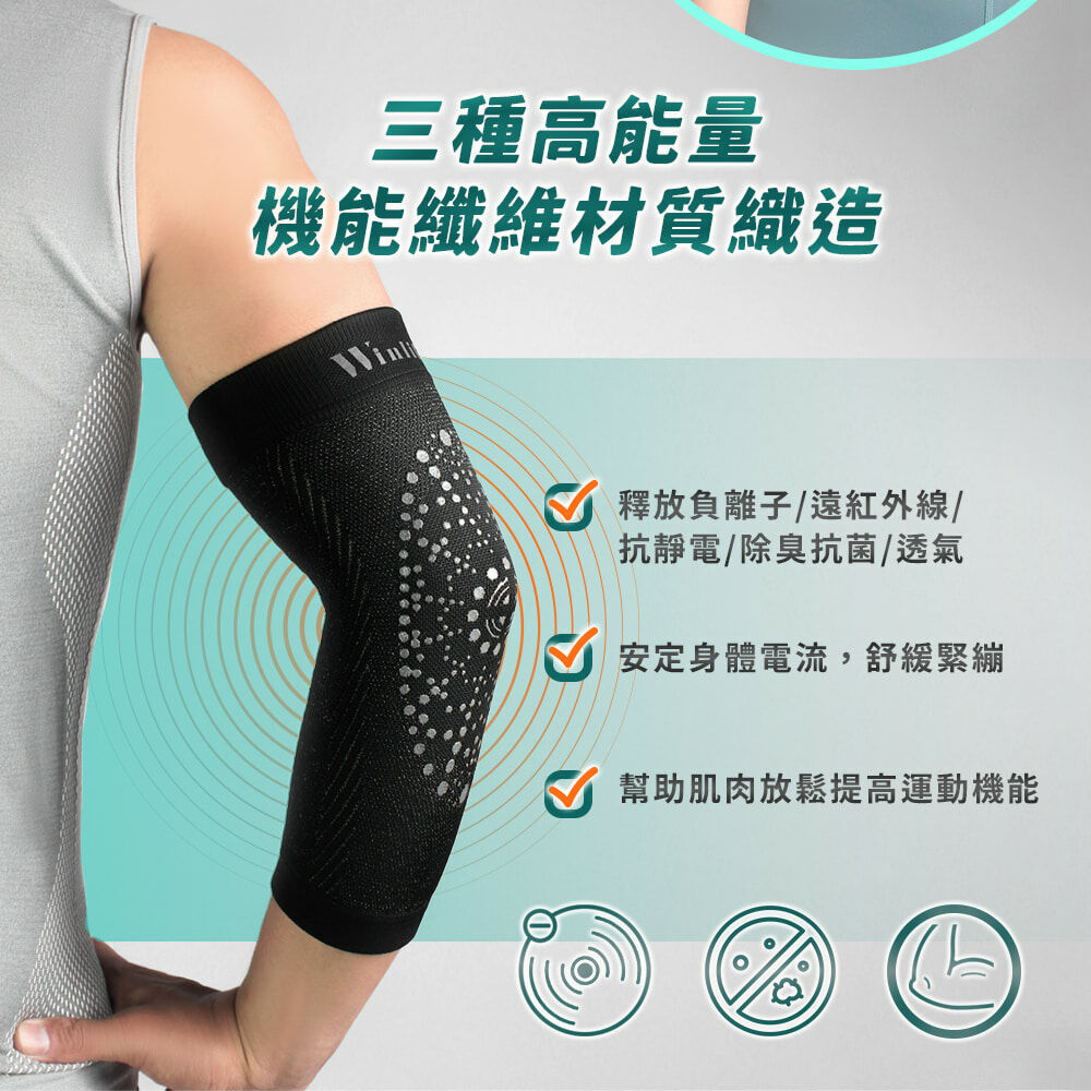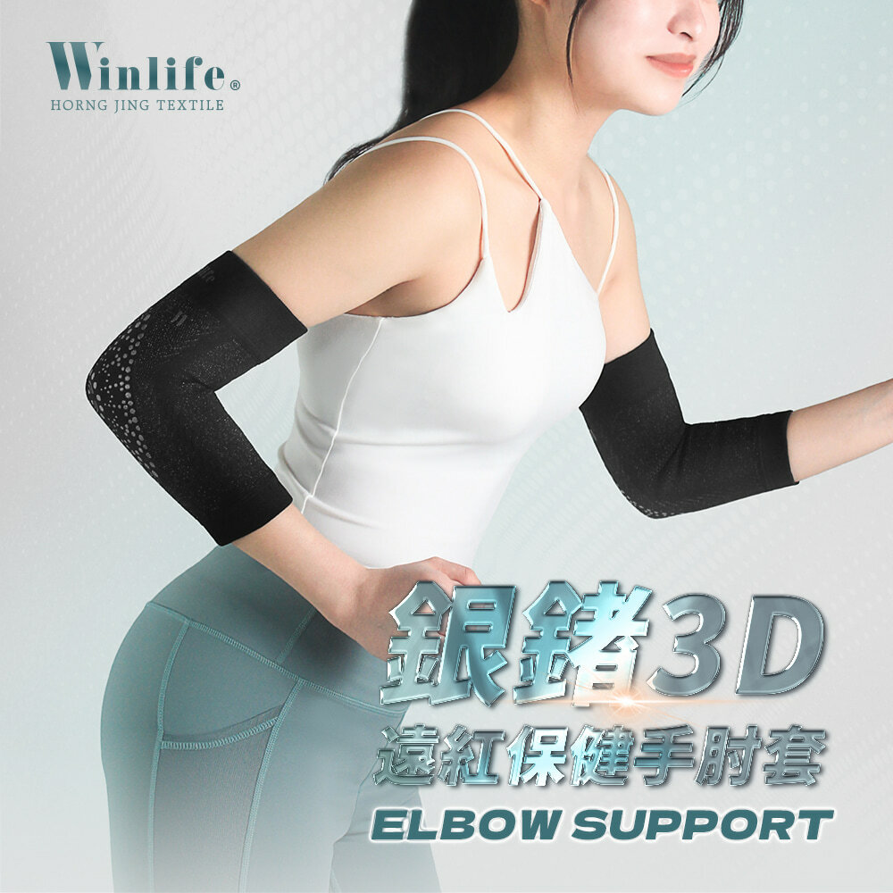 . 銀鍺3D遠紅保健手肘套(Winlife)整雙皆採用『鍺纖維+銀纖維+石墨烯纖維』三種高能量機能纖維材質織造,具有『釋放負離子/遠紅外線/抗靜電/除臭抗菌/透氣』功能,可安定身體電流,舒緩緊繃,故會得到鬆懈也會逐漸放鬆,並可提高運動機能。