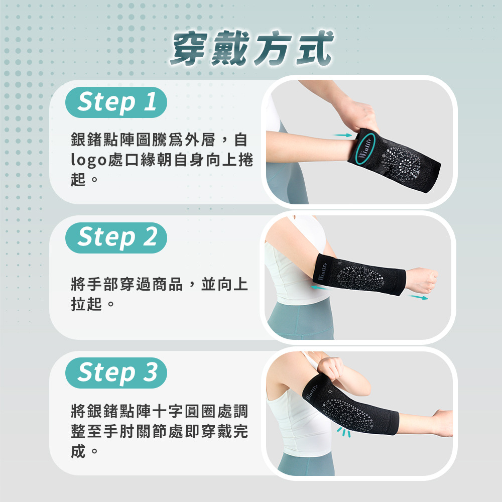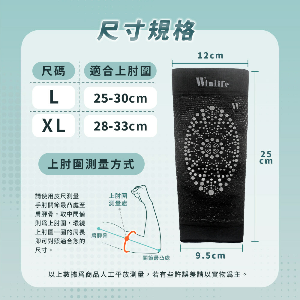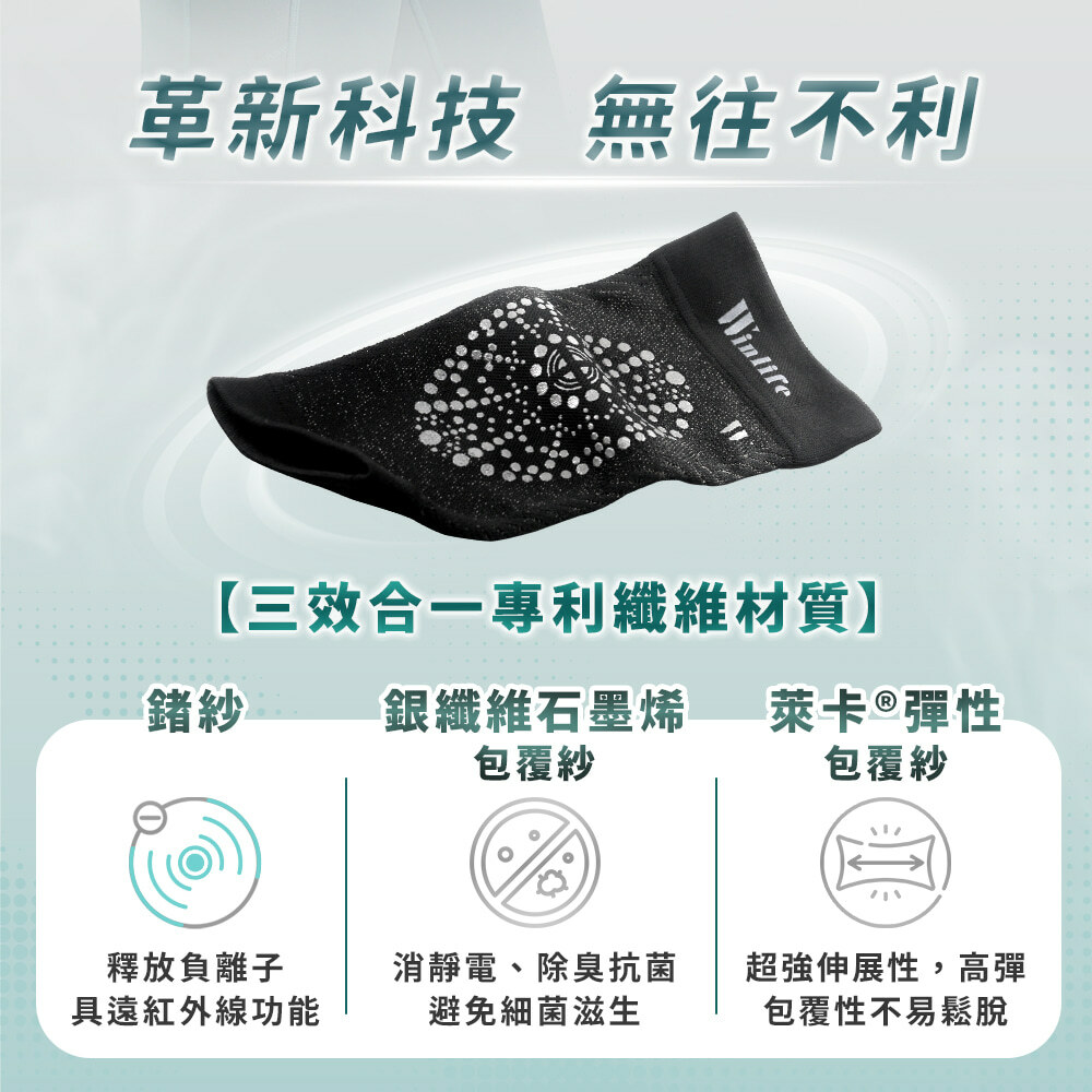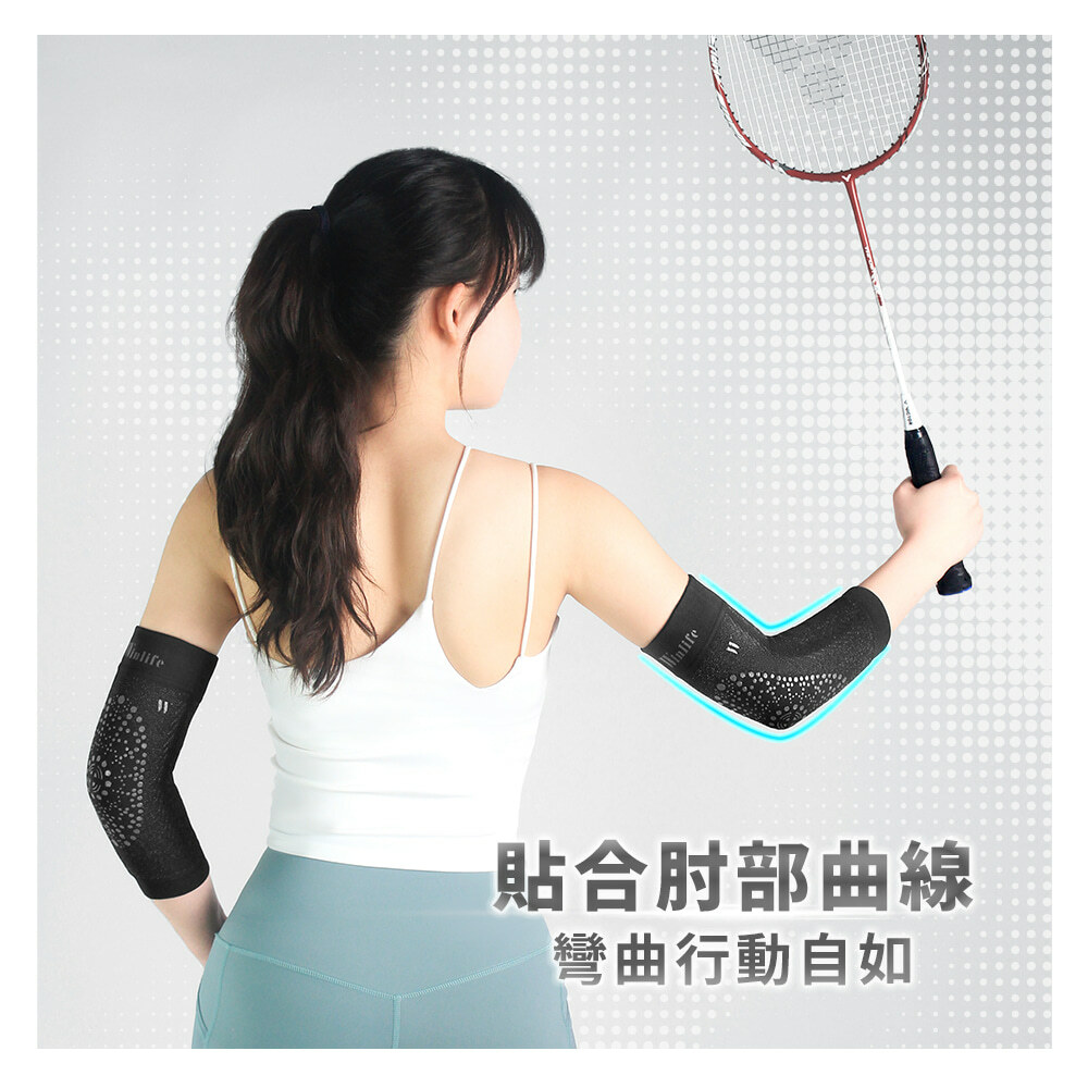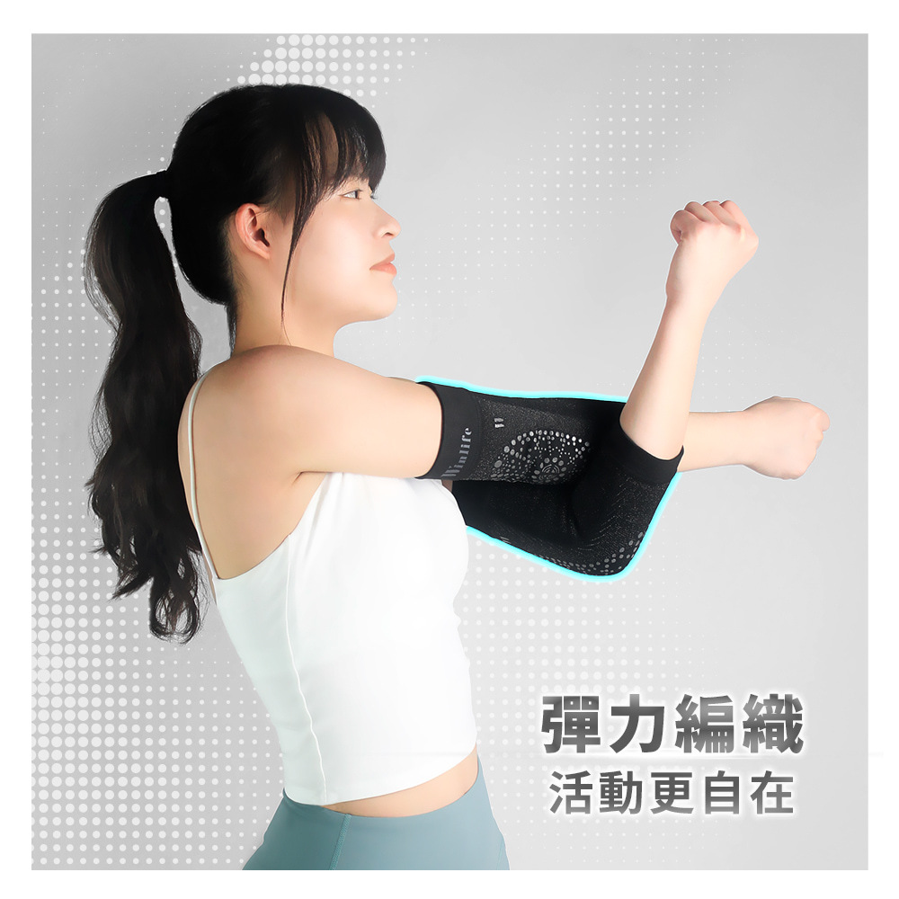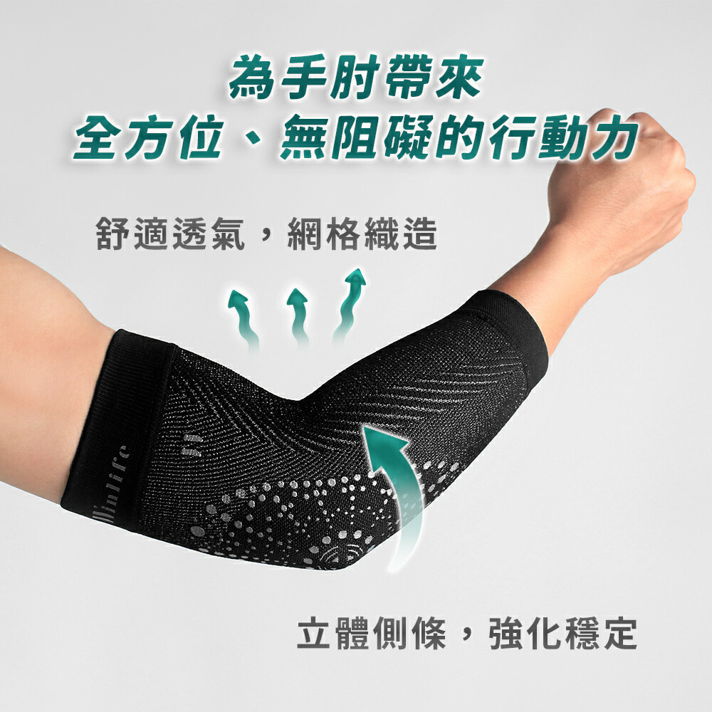 . 銀鍺3D遠紅保健手肘套(Winlife)整雙皆採用『鍺纖維+銀纖維+石墨烯纖維』三種高能量機能纖維材質織造,具有『釋放負離子/遠紅外線/抗靜電/除臭抗菌/透氣』功能,可安定身體電流,舒緩緊繃,故會得到鬆懈也會逐漸放鬆,並可提高運動機能。