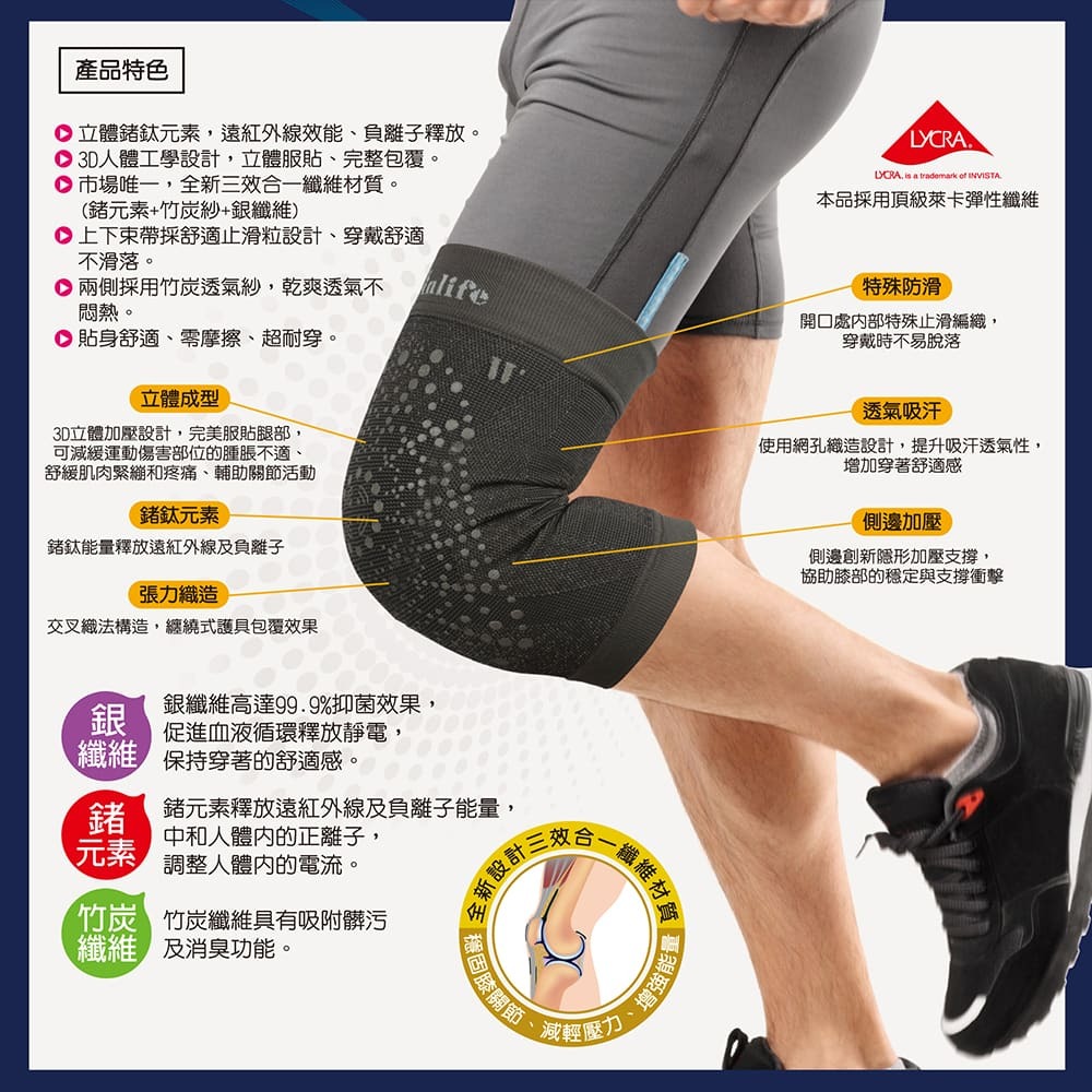 高能量機能纖維能釋放負離子、具遠紅外線功能,中和人體內的正離子,調整人體內的電流,可抗菌殺除臭、消除靜電,促進循環讓身心活絡,可減緩運動後的疲勞不適感,舒緩緊繃、輔助活動。